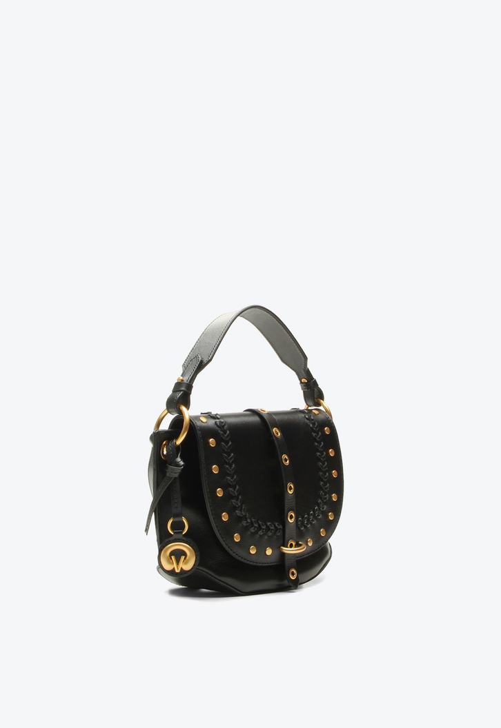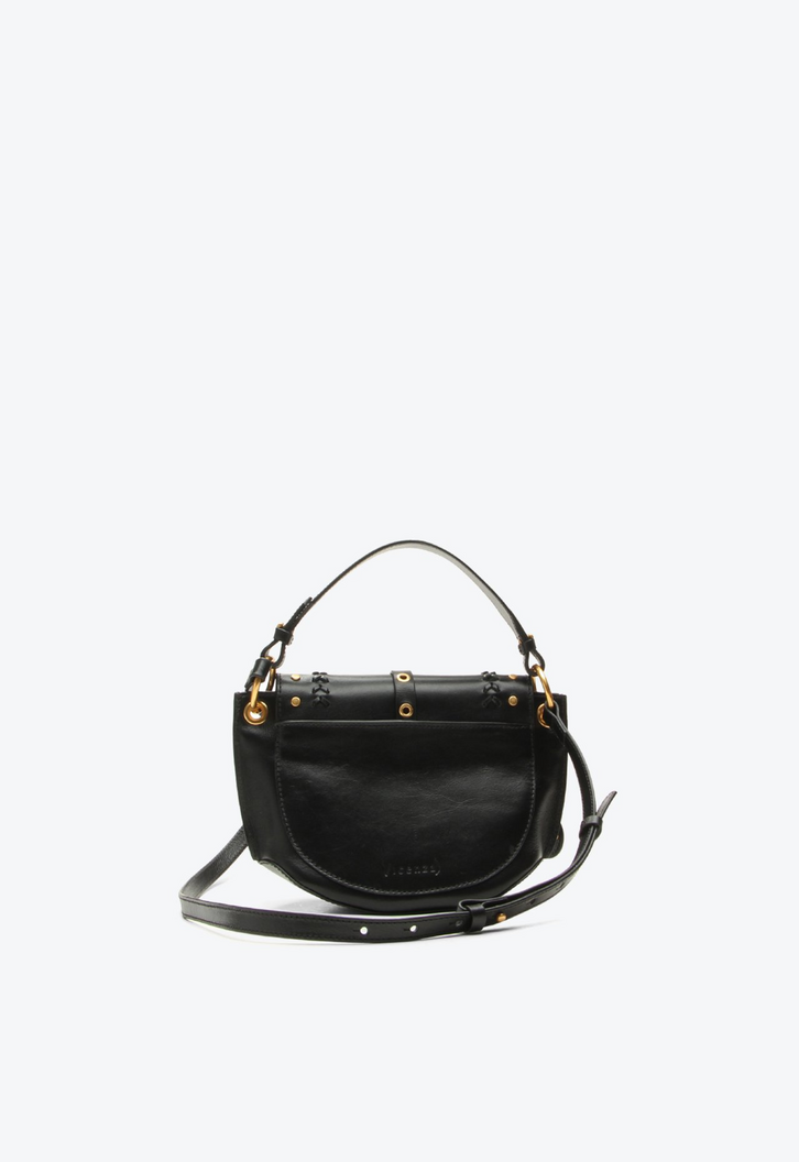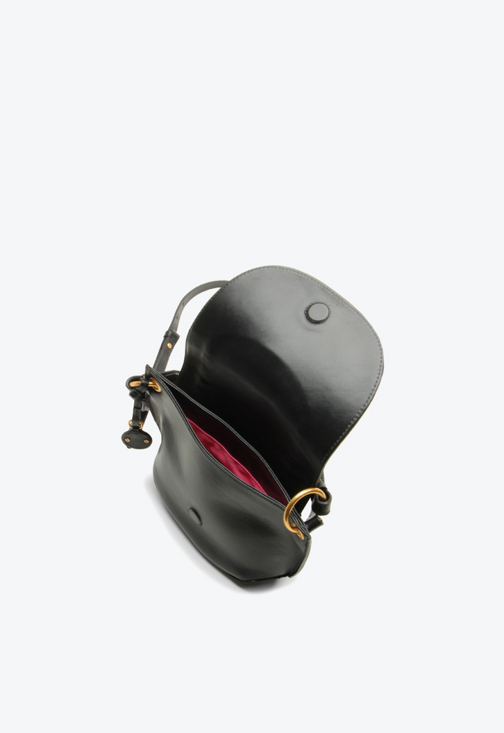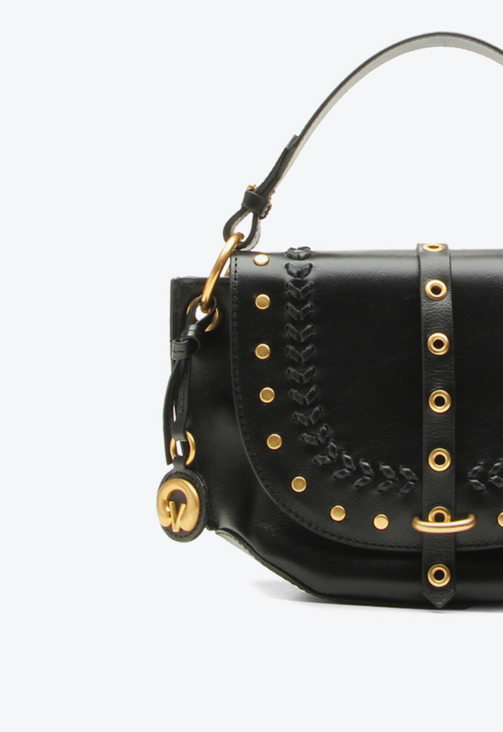 Bolsa pequena em couro preto com alça de mão. Com formato meia-lua, essa bag traz aplicações de adornos metalizados e fivela frontal, conferindo personalidade e estilo marcante em cada detalhe. Compacta e estruturada, a bolsa combina praticidade com design sofisticado. Uma escolha cheia de personalidade para os looks do dia ou da noite.