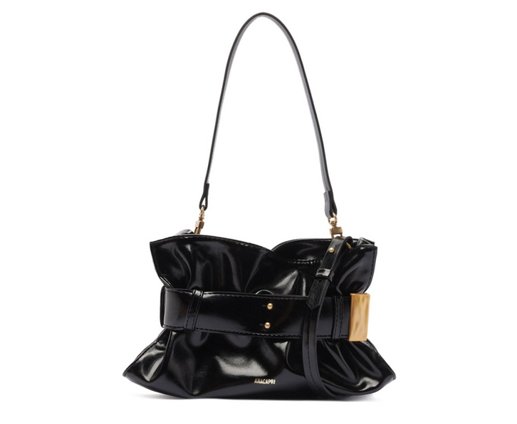 Bolsa tiracolo média, com alças removíveis, na cor preta. De shape retangular trendy, o modelo possui uma alça de ombro em tira fina e outra longa transversal em tira média com regulagem, ambas removíveis por mosquetão. De material similar ao couro com efeito soft acetinado, ela possui detalhe em pregas nas capas. Apresenta detalhe imponente em tira mais larga - tipo cinto - com passador e ponteira metálica exclusiva, que abraça a peça. Com forro vermelho na parte interna, possui etiqueta emborrachada e personalizada Anacapri, com design em ondas. Apresenta fecho por botão de pressão com ímã. Traz assinatura Anacapri em carimbo metálico, centralizada na parte inferior da capa frontal.