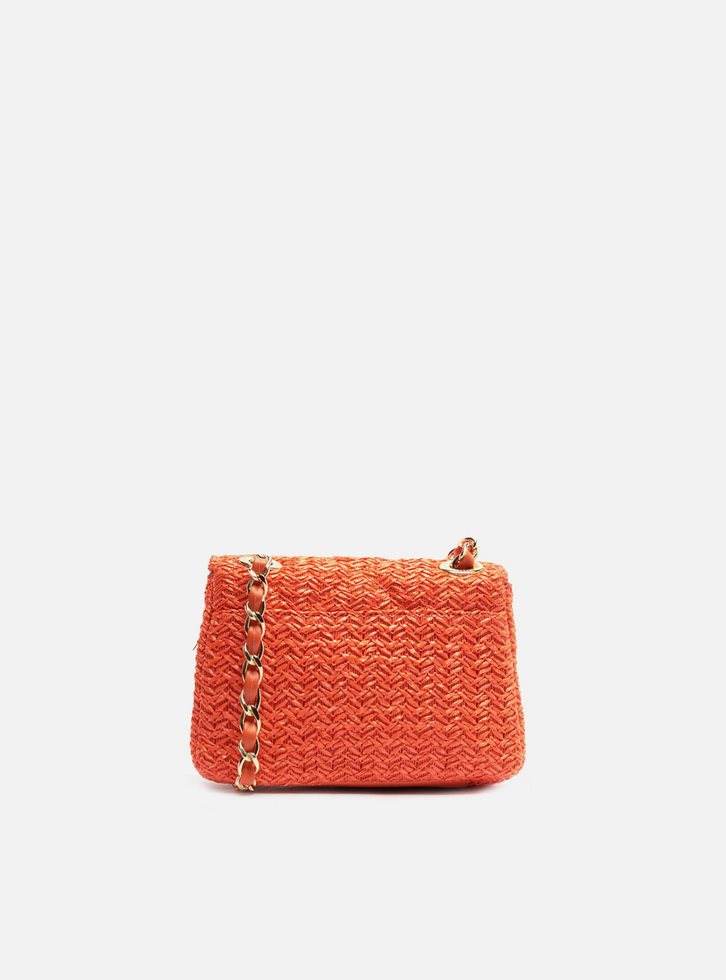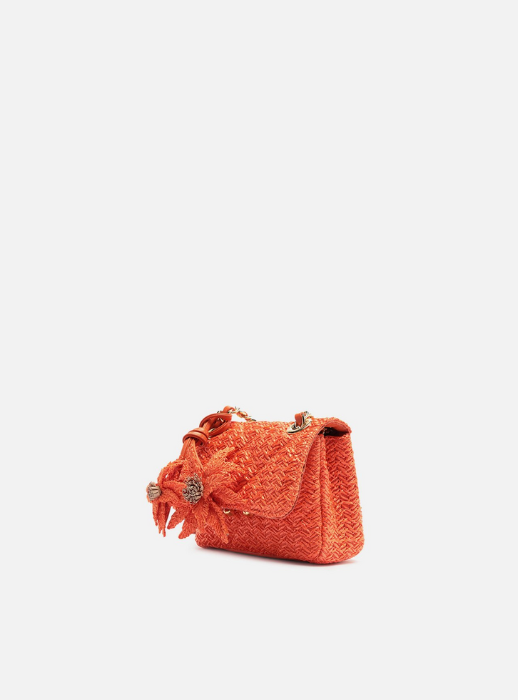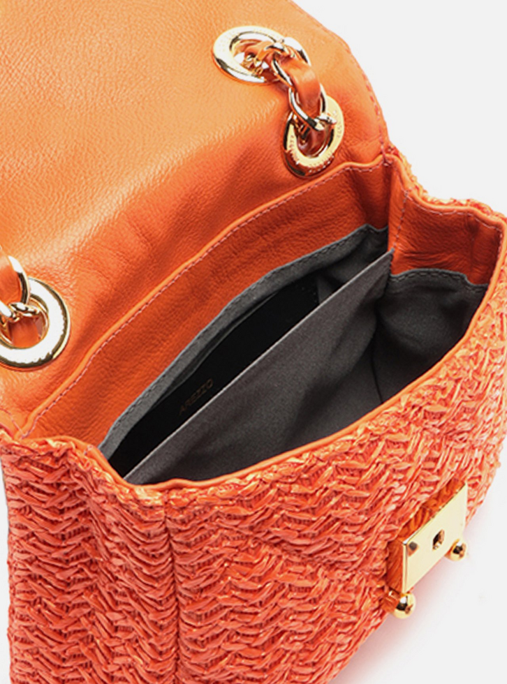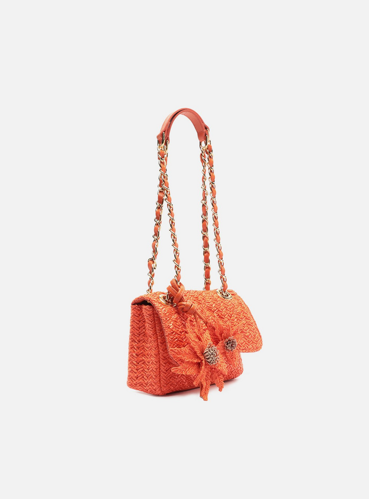 Bolsa tiracolo pequena em ráfia e couro laranja. O acessório tem formato estruturado, capa frontal e tampo com costuras em matelassê. Traz alça em corrente metálica dupla com tiras de couro entrelaçadas e ombreiras, presa à bolsa na parte superior por metais vazados. Possui fecho em tampo frontal e encaixe em peça metálica. Com forro e divisória interna. Bag charm em maxi flores de ráfia com couro.