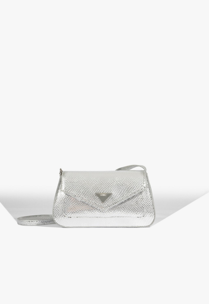 A bolsa de festa prata Liese é a união perfeita entre formato clássico e detalhes modernos. O shape envelope e o acabamento com brilho trazem um ar sofisticado, enquanto os pequenos rebites nas laterais e o fecho triangular em metal dourado adicionam um toque de atitude. Aposte! Comprimento da alça tiracolo: 55 cm | Largura da alça tiracolo: 1,5 cm.