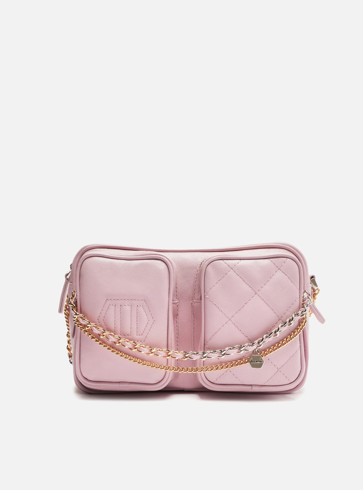Bolsa tiracolo média lilás de couro. O modelo tem formato retangular e estruturado. Traz alça em tira de couro regulável, conectada a correntes na base. Possui fecho superior em zíper e puxador. Traz bolsos externos frontais, um com costura do ID da marca e o outro com matelassê, ambos com fecho em zíper. Com correntes extras bicolores e pingente da marca.