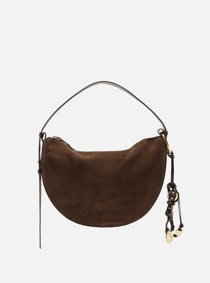Bolsa feminina tiracolo média em couro marrom acamurçado. O acessório tem formato macio e laterais arredondadas, com acabamento em couro acamurçado. Possui alça lateral em couro liso, regulável para diferentes formas de uso. Acompanha bag charm preso por argola à alça, composto por tiras e pingentes metálicos variados. Conta com fecho superior em zíper com puxador.