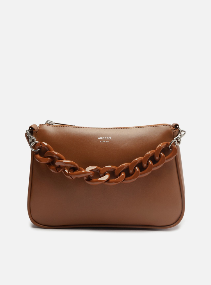 Bolsa tiracolo pequena marrom. O modelo tem formato compacto, estruturado e retangular e acabamento liso. Traz alça lateral fina com regulagem e corrente em acrílico da cor da bolsa, removível e presa por ganchos nas laterais. Possui fecho superior em zíper invertido e puxador.