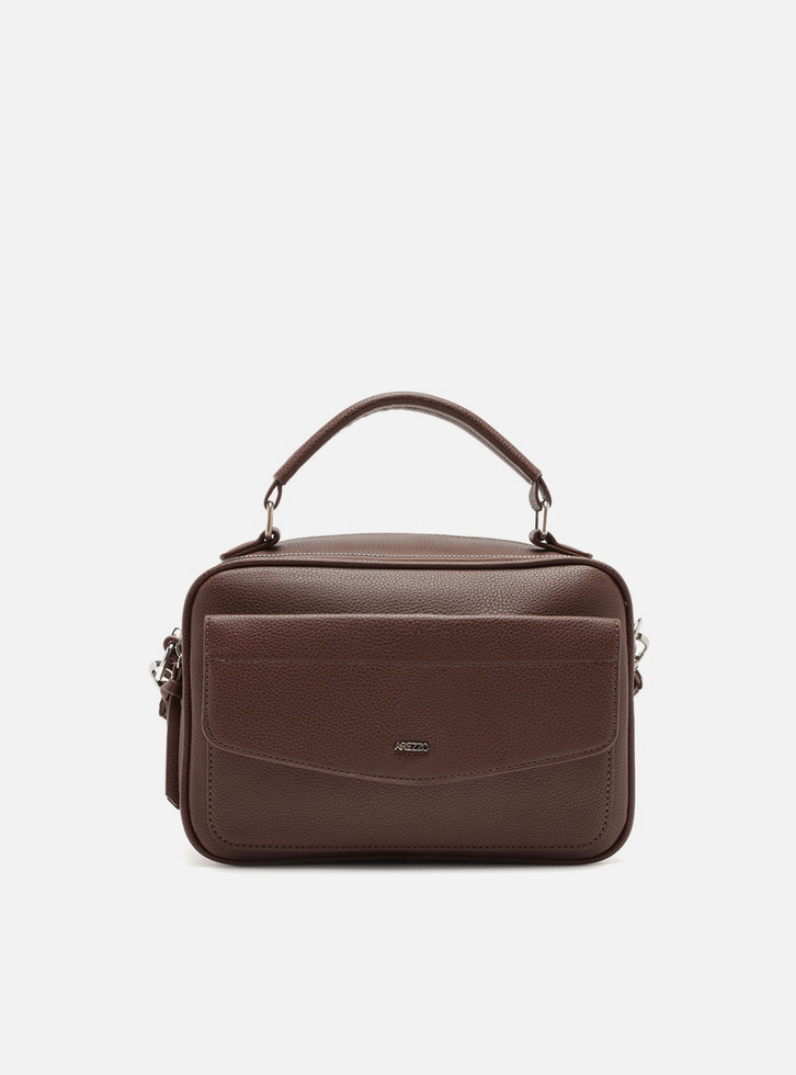 Bolsa tiracolo média marrom. O modelo tem formato camera bag, quadrado e estruturado. Traz alça de mão presa por ilhós metálico, alça lateral removível e fecho superior em zíper com puxador em tiras. Com dois bolsos internos, bolso externo com tampo e imã e inscrição metálica do nome da marca.