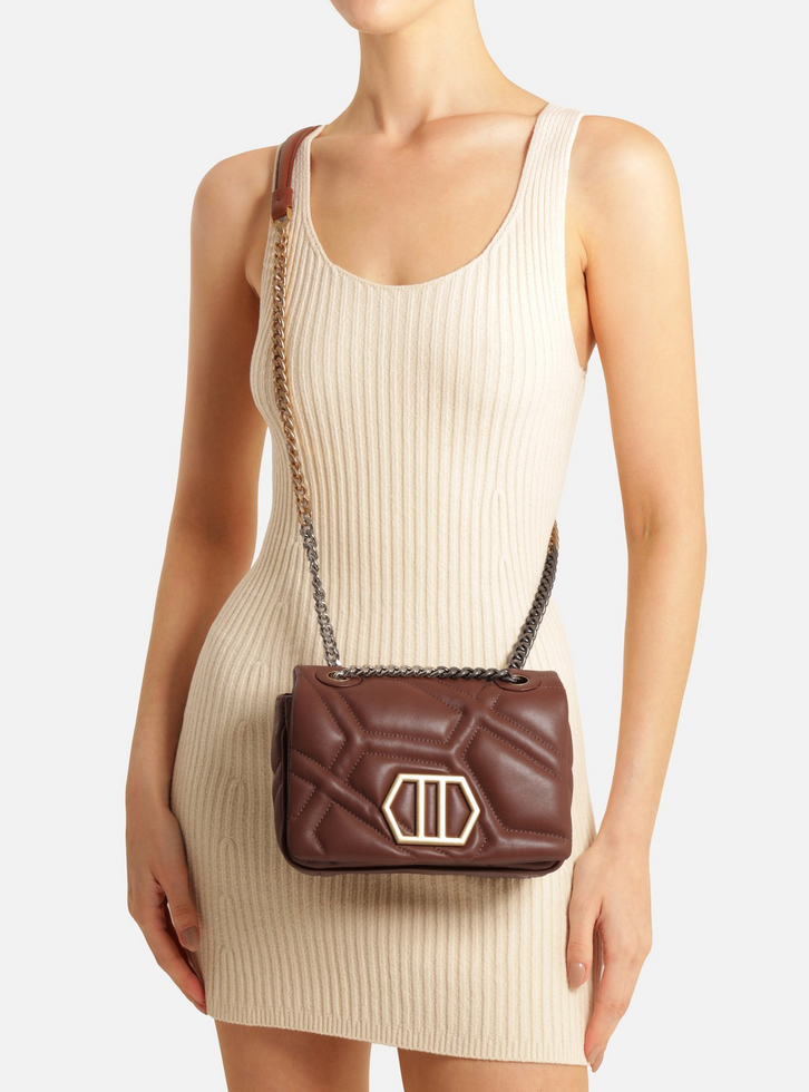 Bolsa tiracolo feminina média de couro marrom. O acessório tem formato estruturado e quadrado e capas com costuras em matelassê geométricas. Traz alça em corrente metálica bicolor e ombreira, presa à bolsa na parte superior por metais vazados. Possui fecho em tampo frontal e imã, além de aplicação de peça metálica, geométrica, grande e vazada na capa. Com forro e divisória interna.