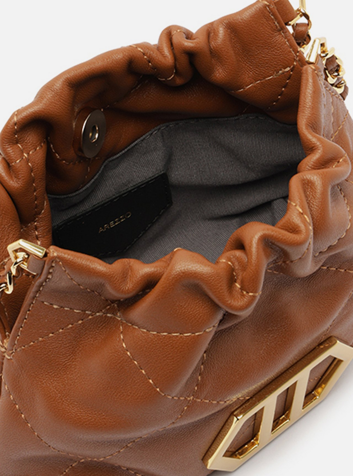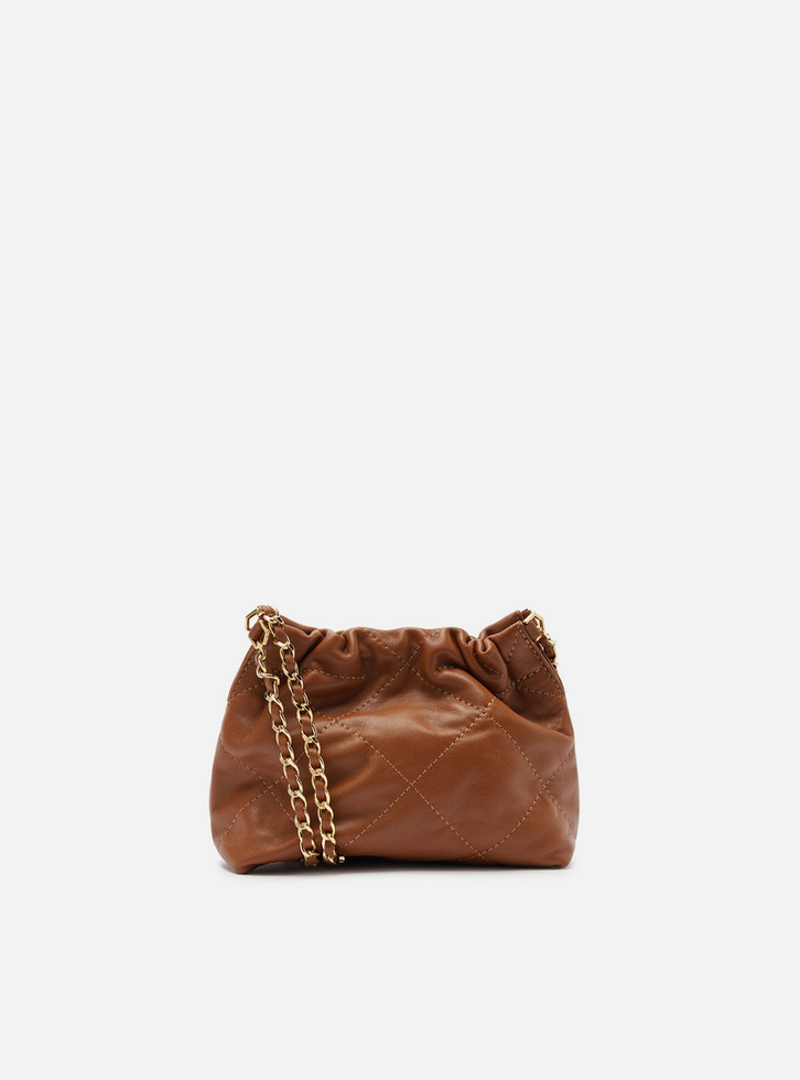 Bolsa tiracolo pequena em couro marrom. O acessório tem formato macio e capas com costuras em matelassê. Traz alça em corrente metálica dupla com tiras de couro entrelaçadas e detalhe em elos hexagonais, além de corrente simples com pingente. Possui borda superior franzida, com alça que passa por dentro, e fecho em imã interno. Com peça de metal, dourada, geométrica e vazada aplicada na capa.