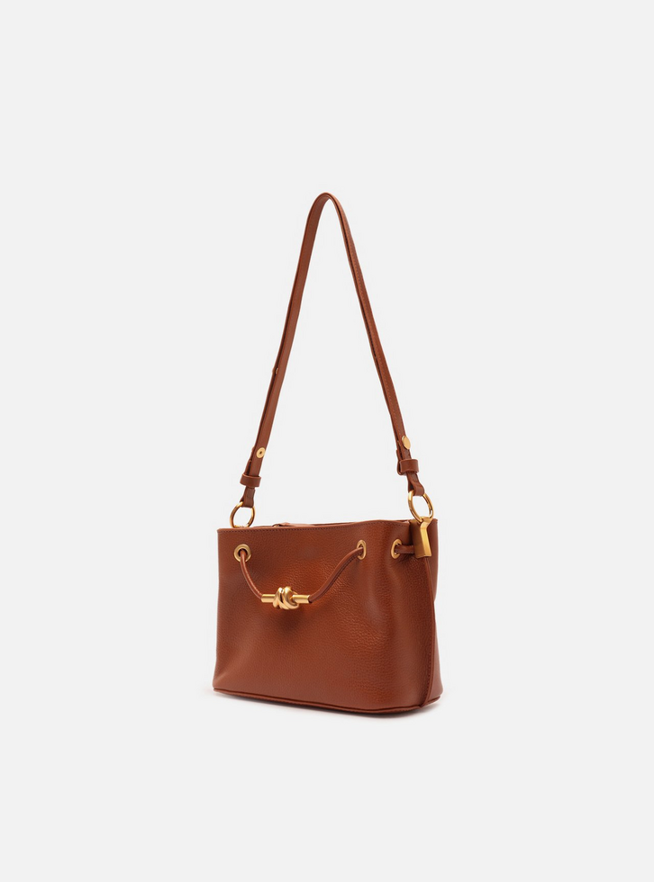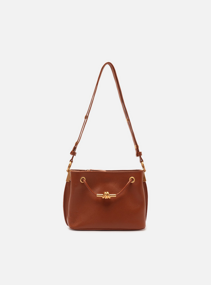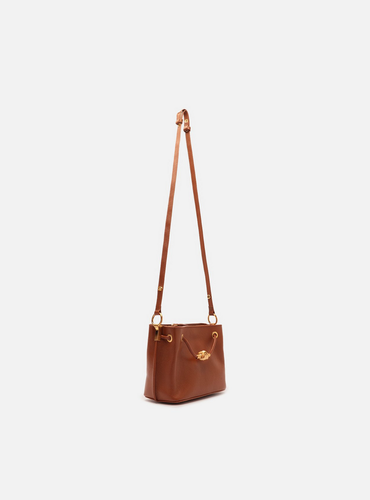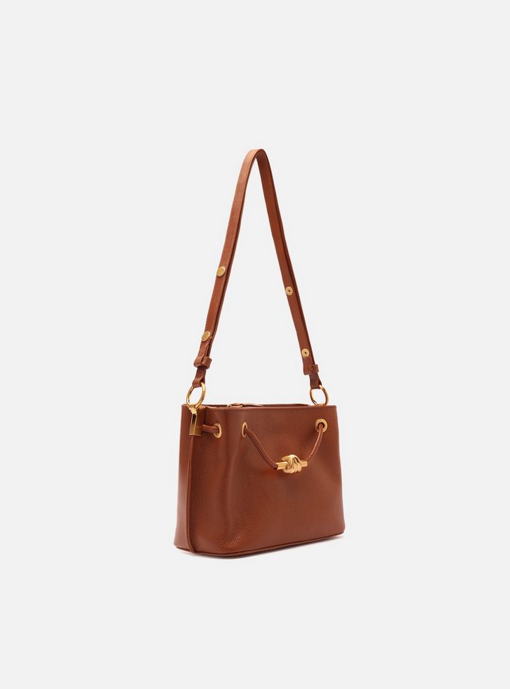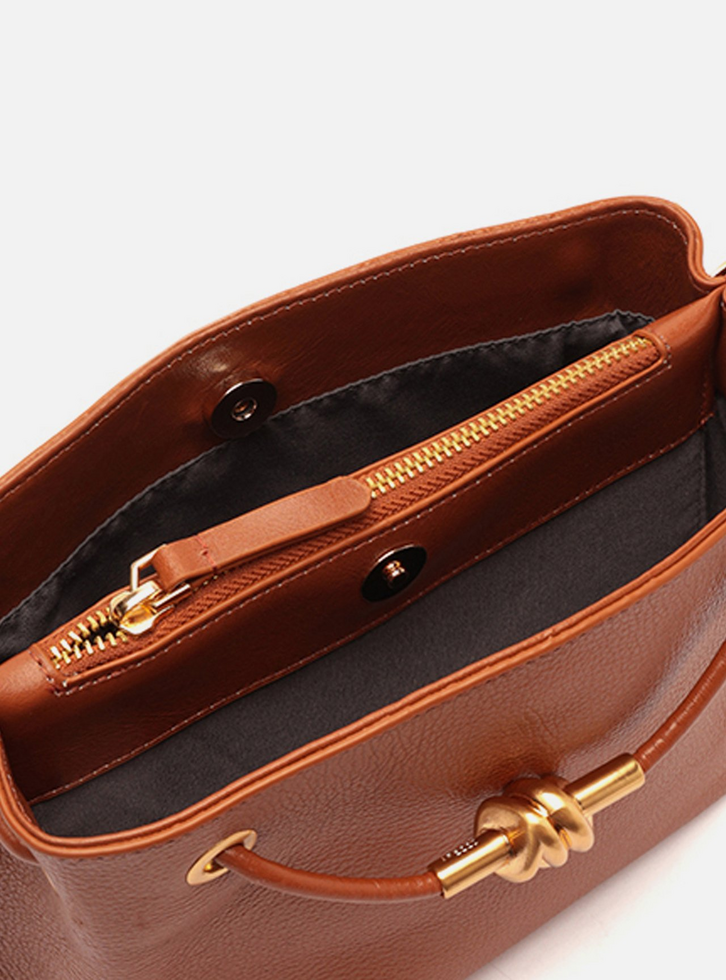 Bolsa tiracolo pequena em couro marrom. O acessório tem formato estruturado e acabamento macio. Traz alça tiracolo fina com regulagem, presa por metais e argolas. Possui fecho em imãs e divisória interna com zíper. Com tira rolotê na parte superior, transpassada por ilhoses e com detalhe em peça de metal que remete a um nó.