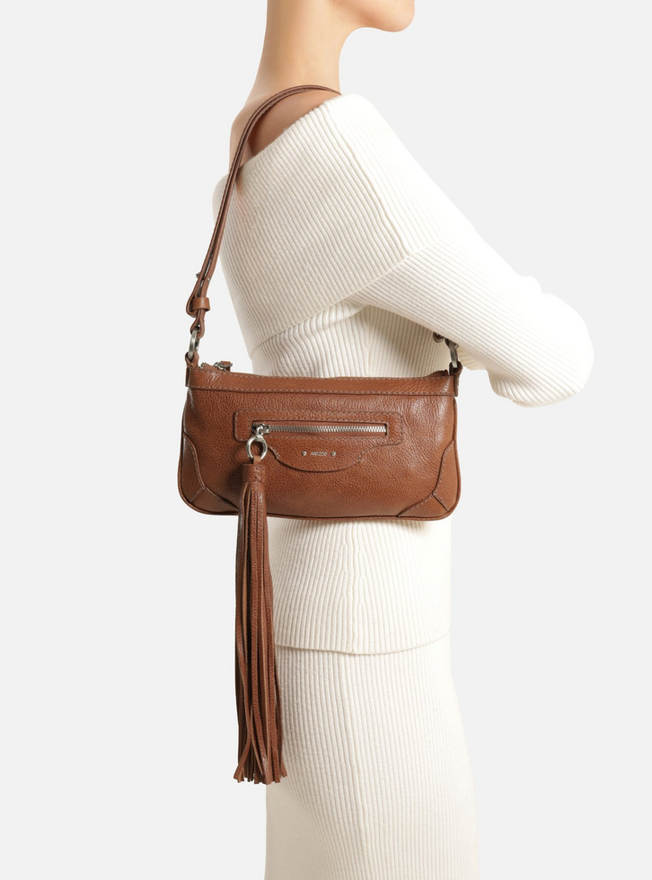 Bolsa tiracolo média de couro marrom. O acessório tem formato estruturado, laterais arredondadas e acabamento macio e levemente texturizado. Traz alça de ombro curta regulável, presa por argolas metálicas na base. Possui fecho superior em zíper. Apresenta contorno superior marcado e aplicação em couro nas laterais da base, além de bolso externo frontal com fecho em zíper, puxador em barbicacho e detalhe do nome da marca.