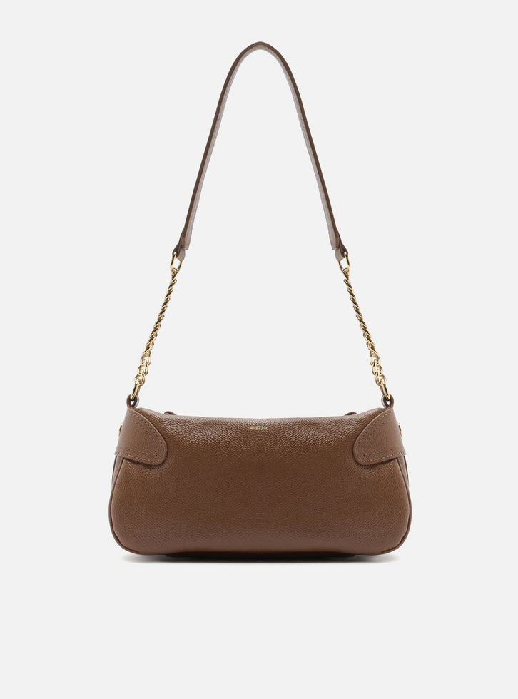 Bolsa tiracolo média marrom em couro. O acessório tem formato estruturado e laterais arredondadas. Traz alça longa com parte em corrente metálica dourada e parte em couro ajustável. Possui fecho superior em zíper com puxador e inscrição discreta do nome da marca na parte frontal. Detalhe em tiras e botão de metal nas laterais.