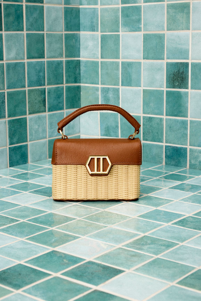 Bolsa feminina tiracolo média em couro marrom e palha tramada. O acessório tem formato estruturado, capa em couro liso marrom e parte inferior em palha tramada natural. Possui alça lateral regulável e alça de mão superior. Conta com fecho frontal e aplicação metálica geométrica. Acompanha bag charm em metal dourado em formato de estrela-do-mar e peça em acrílico em formato de alga.