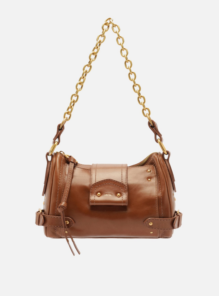 Bolsa feminina tiracolo média de couro marrom. O acessório tem formato estruturado, acabamento liso e laterais arredondadas com detalhe em tiras afiveladas. Traz alça tiracolo longa, regulável e removível e tira curta em corrente metálica dourada, presa por argolas e peças de couro. Fecho em zíper e puxador em tira, além de bolso externo frontal e tira larga sobreposta. Com aplicação de rebites dourados por toda a bolsa.
