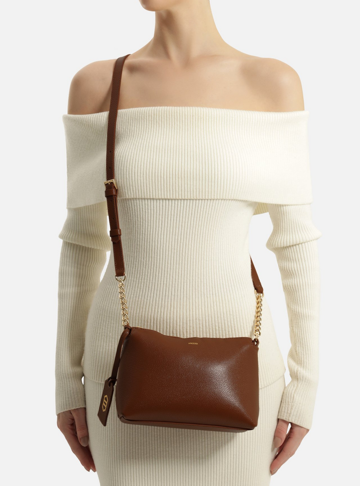 Bolsa feminina tiracolo pequena em couro marrom. O acessório tem formato estruturado e acabamento levemente texturizado. Possui alça lateral regulável em tira de couro, presa por correntes metálicas douradas. Conta com fecho superior em zíper com puxador. Acompanha bag charm preso por tira à bolsa, com detalhe em metal geométrico dourado.