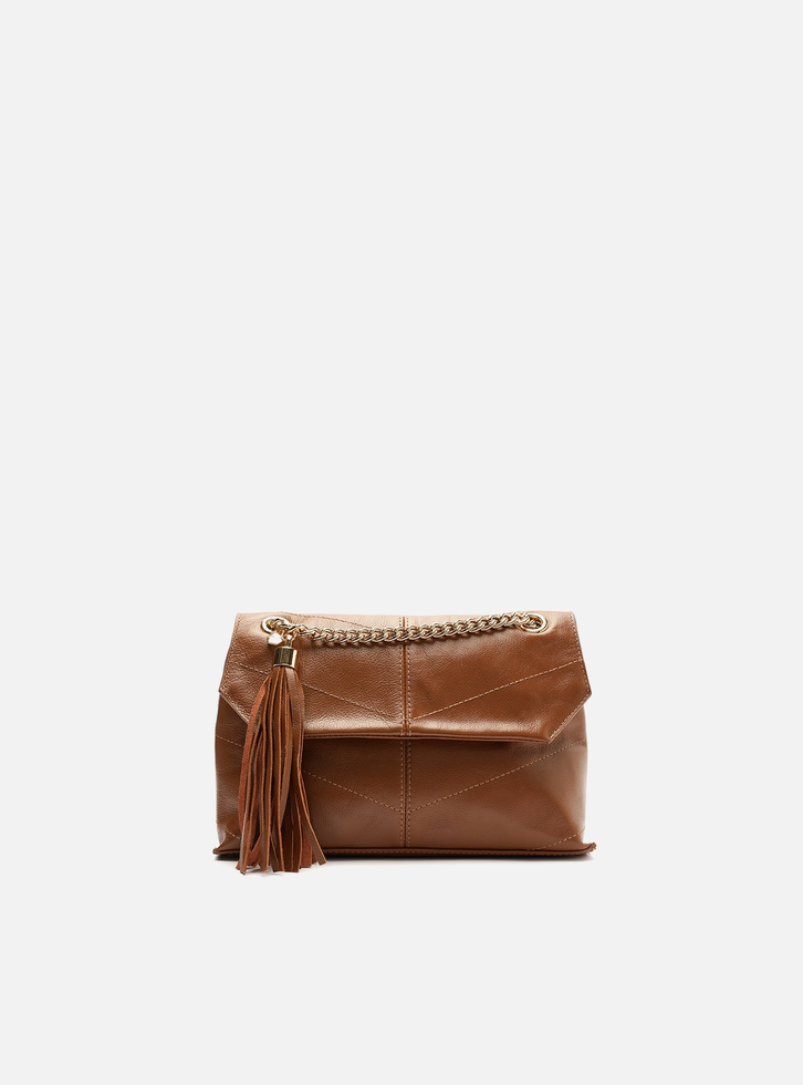 Bolsa tiracolo pequena de couro marrom. O acessório tem formato retangular e costuras pesponto nas capas e emendas. Traz alça lateral em corrente metálica e tira de couro, que passa pela parte superior por ilhoses vazados. Com fecho em tampo frontal e imã. Detalhe em bag charm de barbicacho, preso à alça da bolsa.