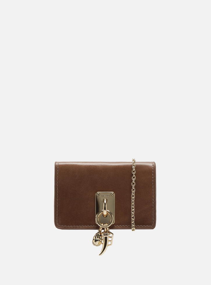Bolsa tiracolo tamanho mini marrom em couro. O acessório tem formato estruturado e acabamento texturizado. Traz fecho frontal em tampo com ímã interno e alça em corrente metálica fina removível. O destaque fica por conta da peça de metal com charms variados na capa frontal.