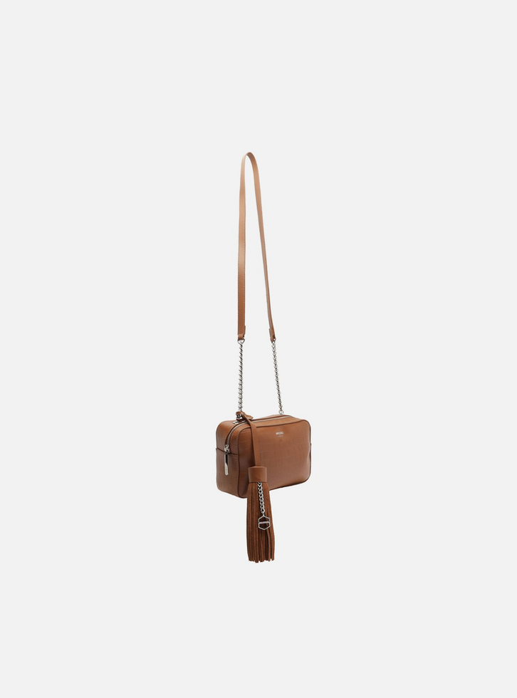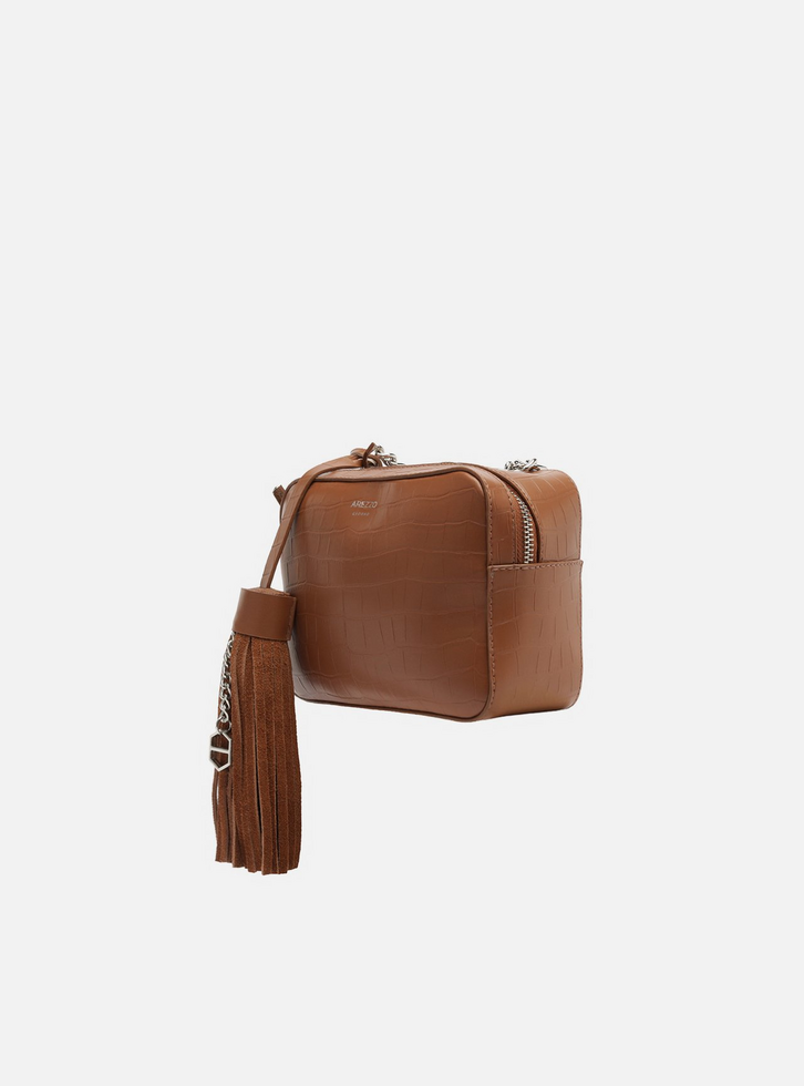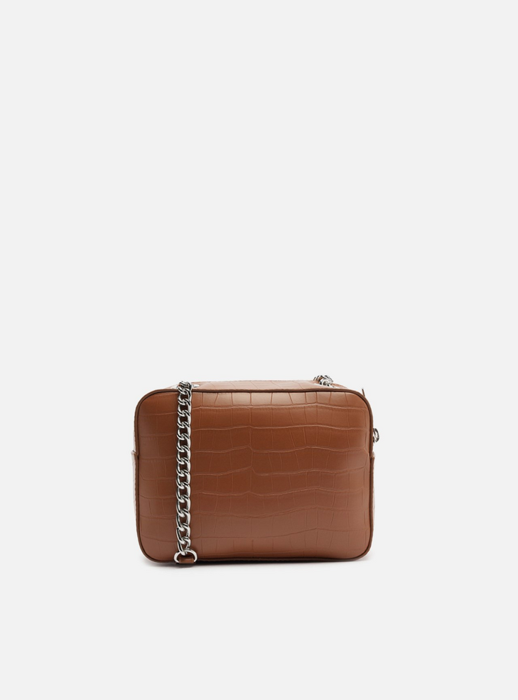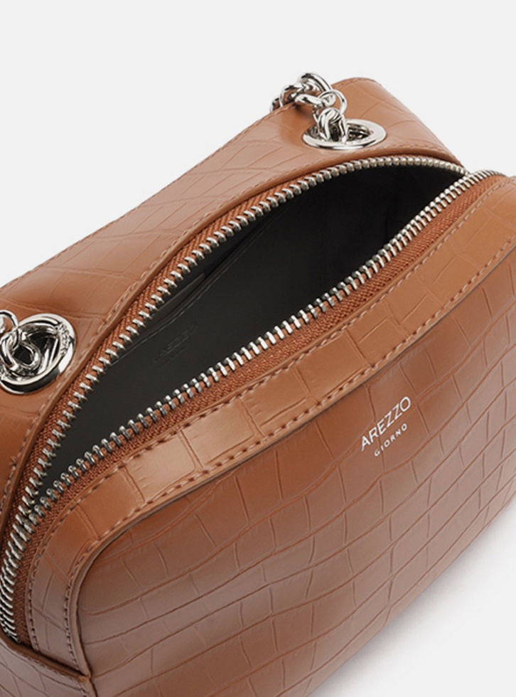 Bolsa tiracolo pequena marrom em material com efeito croco. O acessório tem formato estruturado e laterais arredondadas. Traz alça lateral em tira com corrente metálica. Possui fecho superior em zíper e bag charm em barbicacho de camurcina com corrente metálica e peça geométrica.