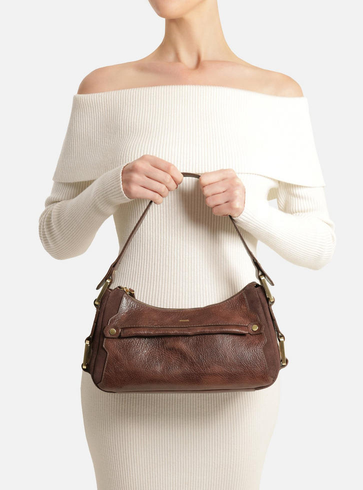 Bolsa tiracolo média em couro e camurça marrom. O acessório tem formato retangular, acabamento desgastado, recortes nas capas e aplicações em camurça. Traz alça de ombro presa por tiras largas sobre as capas, nas laterais, com metais imponentes. Com fecho superior em zíper e puxador em tira. Possui bolso externo frontal com fecho em zíper.