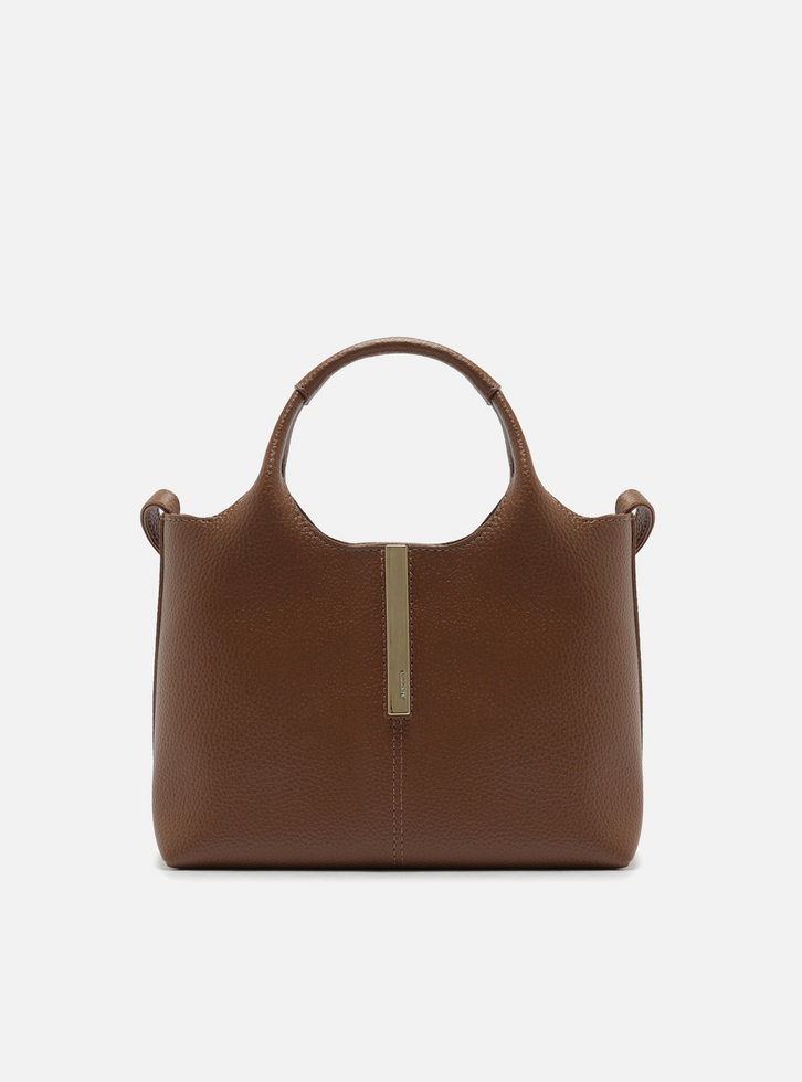Bolsa tiracolo média marrom. O acessório tem formato estruturado e acabamento texturizado. Traz alça longa regulável e alças de mão. Possui fecho superior em zíper com puxador. Conta ainda com detalhe em metal frontal com o nome da marca.