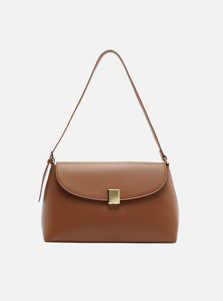 Bolsa feminina tiracolo marrom média. O acessório possui formato estruturado e base levemente arredondada, em material liso e acabamento elegante. Apresenta alça de ombro de espessura média e ajustável. Com fecho frontal em aba de formato curvo, que se prende por um imponente dispositivo de metal dourado. Os metais dourados nas laterais, fixam a alça ao corpo da bolsa.