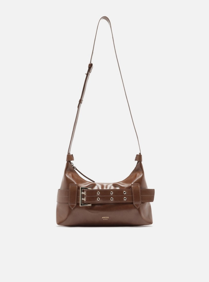 Bolsa tiracolo média marrom. O acessório tem formato estruturado e acabamento envernizado. Traz alça longa regulável, conectada por metais nas laterais. Possui detalhe frontal com tira larga e fivela metálica, além de passadores. Com fecho superior em zíper com puxador e inscrição discreta do nome da marca na parte frontal.