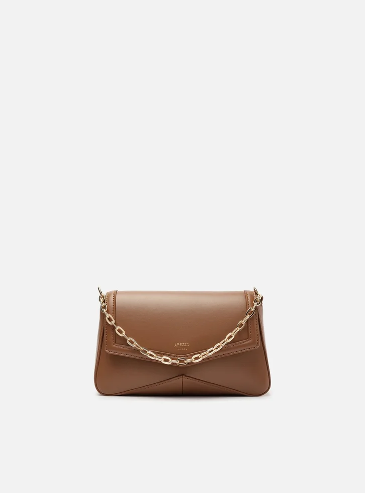 Bolsa tiracolo pequena marrom. O acessório tem formato estruturado e laterais arredondadas. Traz alça em corrente metálica e fecho em tampo frontal. Com inscrição do nome da marca na capa frontal.