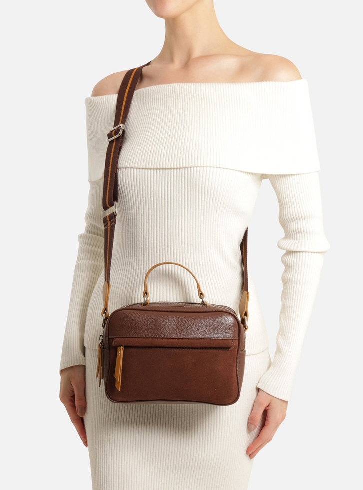 Bolsa feminina tiracolo média marrom escura. O acessório tem formato quadrado e estruturado. Traz alça em tira larga de gorgorão marrom, regulável e com porta-alça. Possui alça de mão marrom clara e dois bolsos superiores com fecho em zíper e puxadores. Com bolso externo frontal acamurçado e fecho em zíper.