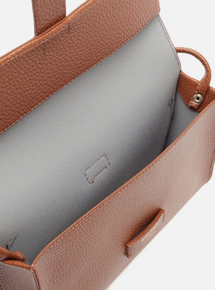 Bolsa tiracolo pequena marrom. O acessório tem formato retangular, laterais arredondadas e acabamento texturizado. Traz alça lateral fina e fecho em tampo frontal com encaixe em tira e detalhe do nome da marca.