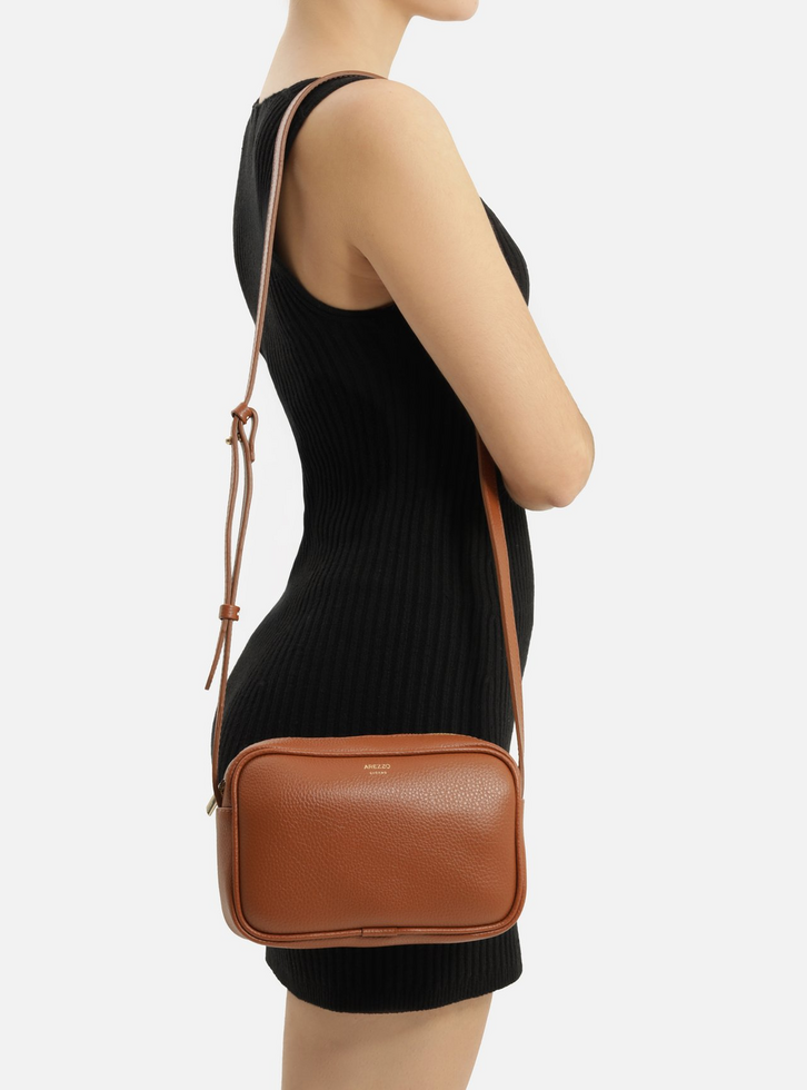 Bolsa tiracolo feminina pequena marrom. O acessório tem formato retangular e estruturado, laterais arredondadas e acabamento texturizado. Traz alça lateral longa em tira com regulagem. Possui fecho superior em zíper com puxador e acompanha dois bag charms: um em barbicacho de camurcina e outro em metal com o nome da marca. Com interior forrado.