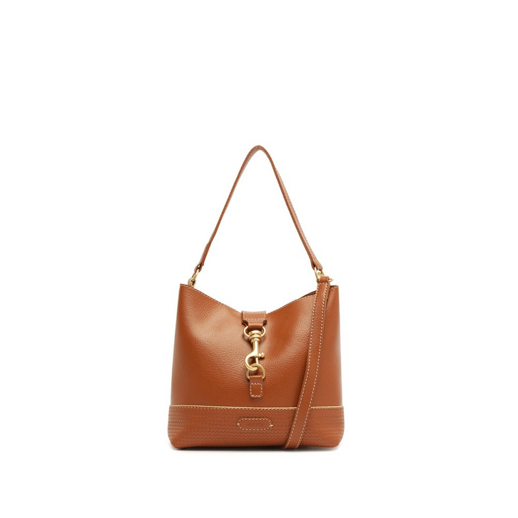 Bolsa mini bucket bicolor pequena, na cor marrom. O modelo de tamanho P é feito em material similar ao couro. Com shape retangular e estruturado, traz duas alças de mão dobradas e uma alça transversal, regulável e removível por mosquetão. Apresenta detalhe em textura tramada em toda a borda inferior da peça, com aplicação de etiqueta e assinatura Anacapri, centralizada na capa frontal. O modelo possui uma divisória grande na parte interna, no mesmo tom da bolsa, com fecho superior em zíper metálico, com puxador em tira. A bolsa apresenta fechamento por com lapela metálica com aplicação de um maxi mosquetão imponente - centralizado no adorno exclusivo.