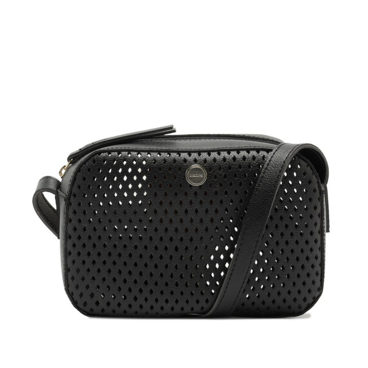 Bolsa tiracolo Ana média, na cor preta. De material similar ao couro, o modelo tem formato retangular, laterais arredondadas e acabamento com detalhe vazado nas capas. Traz alça longa transversal e regulável, com fecho superior em zíper com puxador em tira. Traz pin metálico redondo em bimetal personalizado, com acabamento escovado e assinatura Anacapri, centralizado na parte superior da capa frontal.