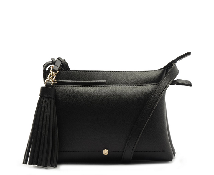 Bolsa tiracolo média preta, em material similar ao couro. O modelo possui shape estruturado com acabamento liso e detalhe de costura ornamental na capa, além de aplicação de rebite personalizado. Traz bolso frontal acoplado e fechamento superior em zíper. Vem com alça tiracolo fina, regulável e fixa, além de bag charm removível em barbicacho, com detalhe de enfeite metálico em cápsula. Na parte interna, apresenta forro em tom rosé e bolso flat funcional.