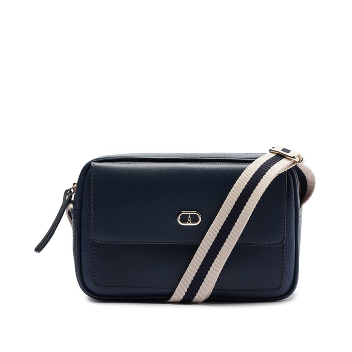 Bolsa tiracolo média, com detalhe de bolso frontal, na cor azul. O modelo vem para a temporada com o shape best seller: retangular e estruturado, com laterais arredondadas. De material similar ao couro, com acabamento texturizado e detalhe de costura a fio nos contornos. Traz alça longa transversal e confortável com regulagem, em fita de gorgurão bicolor. Possui fechamento superior em zíper e bolsinho interno. Traz bolso flat externo grande - aplicado na capa frontal - com fecho no tampo, por botão de ímã. Apresenta aplicação de pin metálico em cápsula, com inscrição da inicial “A” - assinatura Anacapri, centralizado na parte superior do bolso frontal.