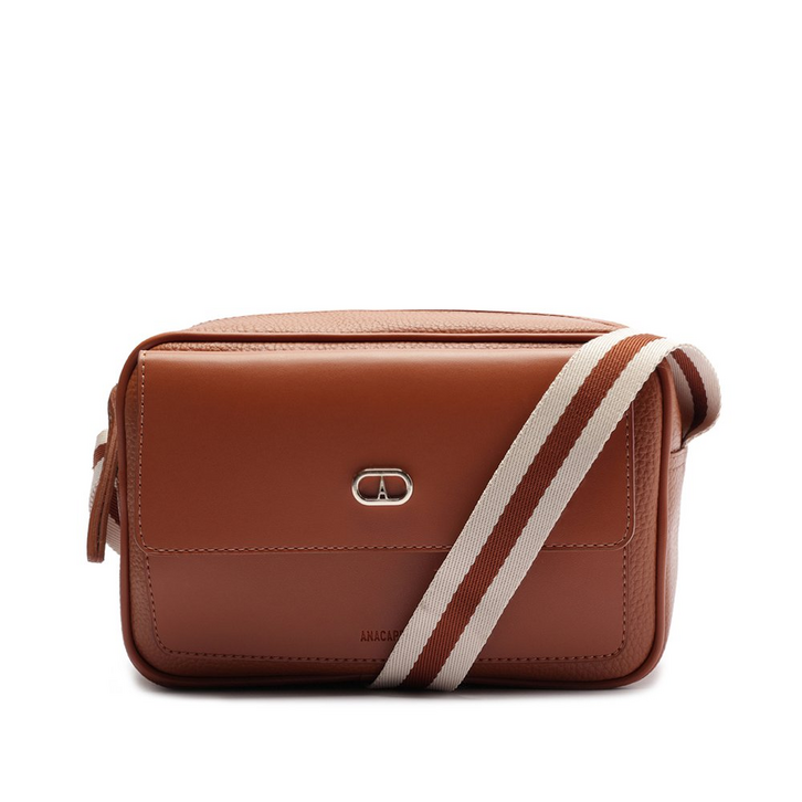 Bolsa tiracolo média, com detalhe de bolso frontal, na cor marrom. O modelo vem para a temporada com o shape best seller: retangular e estruturado, com laterais arredondadas. De material similar ao couro, com acabamento texturizado e detalhe de costura a fio nos contornos. Traz alça longa transversal e confortável com regulagem, em fita de gorgurão bicolor. Possui fechamento superior em zíper e bolsinho interno. Traz bolso flat externo grande - aplicado na capa frontal - com fecho no tampo, por botão de ímã. Apresenta aplicação de pin metálico em cápsula, com inscrição da inicial “A” - assinatura Anacapri, centralizado na parte superior do bolso frontal.