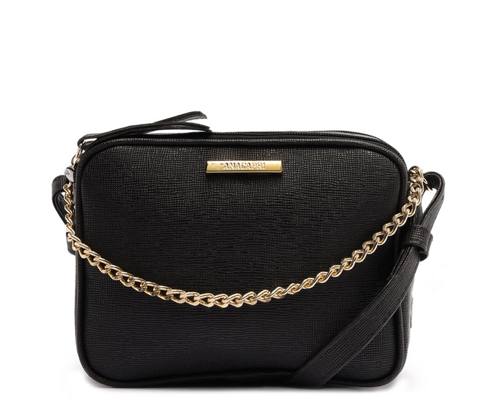 Bolsa tiracolo média, com aplicação de corrente, na cor preta. Com shape retangular com acabamento arredondado nos cantos e contorno em tira bombada, o modelo possui uma alça longa regulável. Feita em material similar ao couro floater com textura, apresenta design superior com duas divisórias - ambas com fechamento por zíper e puxadores em tiras finas. Possui detalhe para alça frontal fixa, em correntaria metálica imponente. Traz aplicação de pin metálico retangular com assinatura Anacapri, centralizado na parte superior da capa frontal.