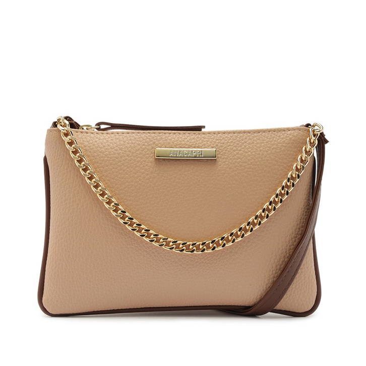 Bolsa tiracolo média, com aplicação de corrente, na cor bege. Com shape flat retangular, o modelo possui uma alça longa regulável. Feita em material similar ao couro floater com textura, apresenta fecho superior em zíper, com puxador em tira, com detalhe para alça frontal fixa, em correntaria metálica imponente. Traz aplicação de pin metálico retangular com assinatura Anacapri, centralizado na parte superior da capa frontal.