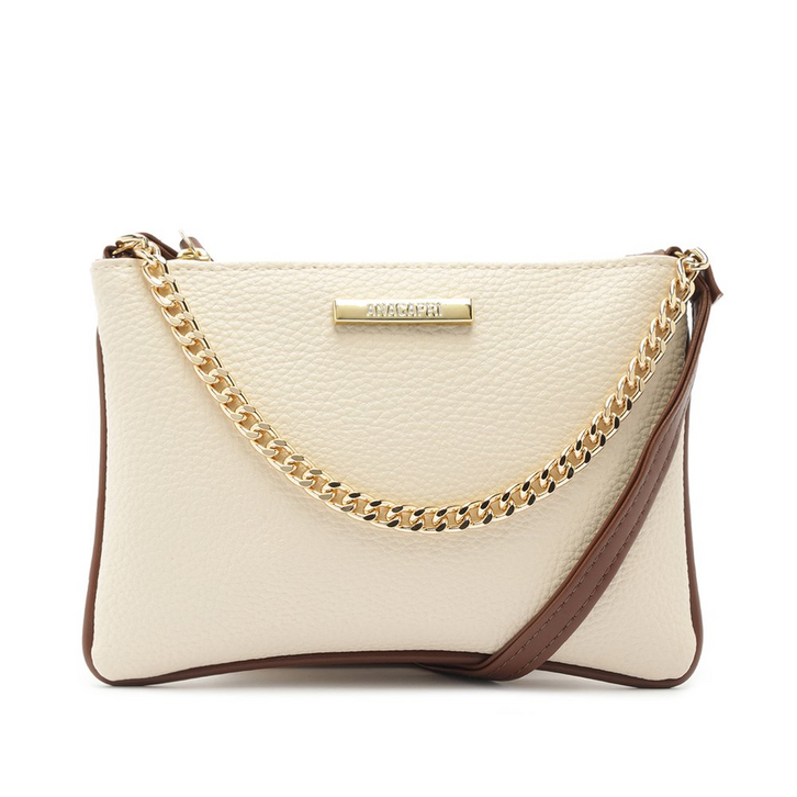 Bolsa tiracolo média, com aplicação de corrente, na cor branca. Com shape flat retangular, o modelo possui uma alça longa regulável. Feita em material similar ao couro floater com textura, apresenta fecho superior em zíper, com puxador em tira, com detalhe para alça frontal fixa, em correntaria metálica imponente. Traz aplicação de pin metálico retangular com assinatura Anacapri, centralizado na parte superior da capa frontal.
