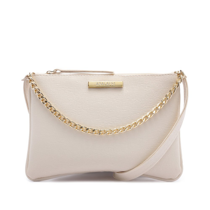 Bolsa tiracolo média, com aplicação de corrente, na cor branca. Com shape flat retangular, o modelo possui uma alça longa regulável. Feita em material similar ao couro floater com textura, apresenta fecho superior em zíper, com puxador em tira, com detalhe para alça frontal fixa, em correntaria metálica imponente. Traz aplicação de pin metálico retangular com assinatura Anacapri, centralizado na parte superior da capa frontal.