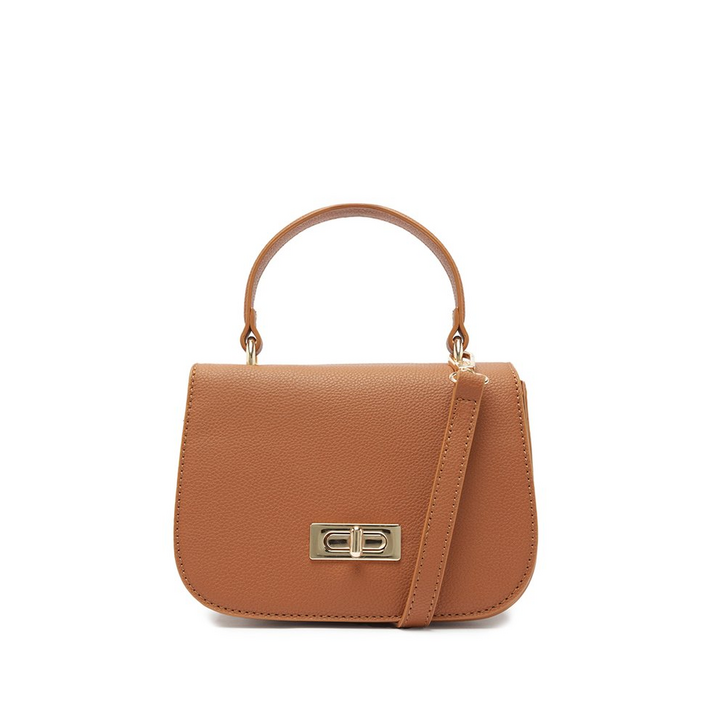 Bolsa tiracolo média, com fecho metálico, na cor marrom. O modelo de material similar ao couro com efeito texturizado, possui shape estruturado, com acabamentos arredondados nos cantos. Traz uma alça de mão estruturada e fixa por elos metálicos, com uma alça longa transversal e removível por mosquetão. Apresenta fecho no tampo - estilo carteiro - por peça metálica de encaixe. Na parte interna, traz forro especial colorido, etiqueta emborrachada com a frase personalizada Anacapri: “leve a vida numa bolsa”, com bolsinho de fecho em zíper com puxador em tira fina. Contornada por costura pesponto delicada em toda a peça, traz assinatura Anacapri em carimbo metálico, centralizada na parte inferior da capa traseira.
