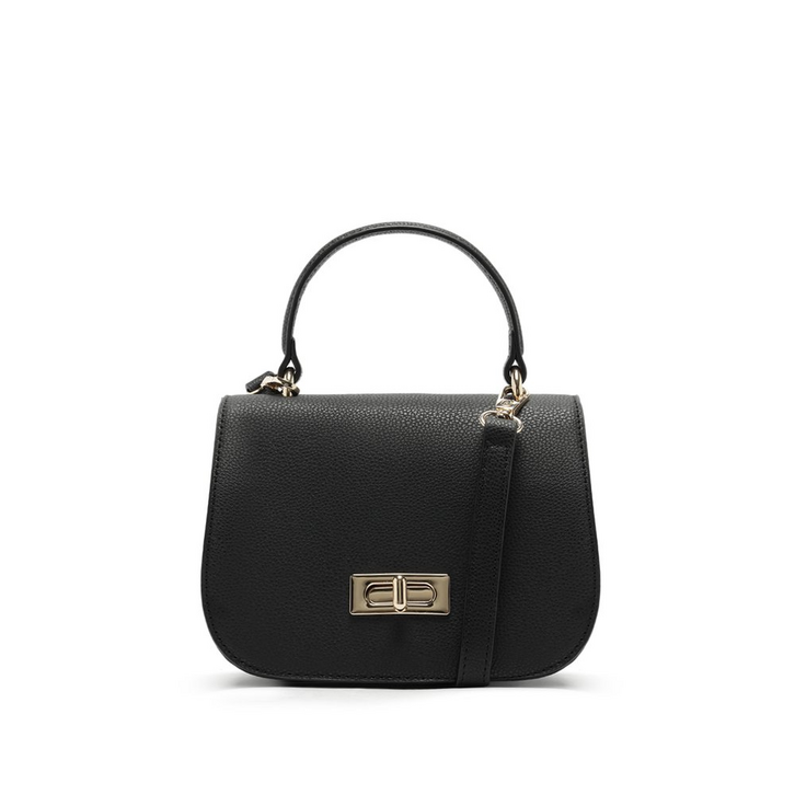 Bolsa tiracolo média, com fecho metálico, na cor preta. O modelo de material similar ao couro com efeito texturizado, possui shape estruturado, com acabamentos arredondados nos cantos. Traz uma alça de mão estruturada e fixa por elos metálicos, com uma alça longa transversal e removível por mosquetão. Apresenta fecho no tampo - estilo carteiro - por peça metálica de encaixe. Na parte interna, traz forro especial colorido, etiqueta emborrachada com a frase personalizada Anacapri: “leve a vida numa bolsa”, com bolsinho de fecho em zíper com puxador em tira fina. Contornada por costura pesponto delicada em toda a peça, traz assinatura Anacapri em carimbo metálico, centralizada na parte inferior da capa traseira.