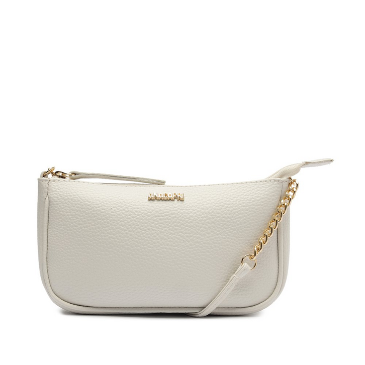 Bolsa Tiracolo Média Fun Branco. A bolsa traz shape estruturado e retangular no tamanho médio. O modelo possui alça longa transversal com aplicação de correntaria de metal imponente. Forrada, apresenta fecho superior em zíper com puxador em tira fina. Traz assinatura Anacapri em aviamento metálico aplicado na capa frontal.