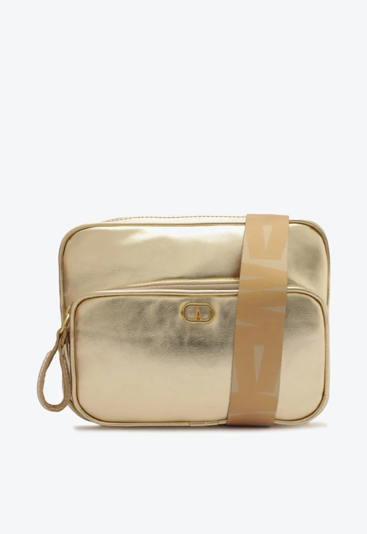 Bolsa tiracolo Estação Anacapri média com alça de gorgurão dourada. De shape retangular com acabamento arredondado nos cantos, o modelo possui uma alça transversal e regulável em fita de gorgurão com estampa personalizada da “Estação Anacapri”. De material similar a couro e forrada na parte interna, apresenta bolso externo, traz fechos superiores em zíper com puxador em fita de gorgurão, com etiqueta emborrachada personalizada Anacapri. O modelo traz aplicação de pin metálico em cápsula, com inscrição da inicial “A” - assinatura Anacapri, centralizado na capa frontal do bolso externo.