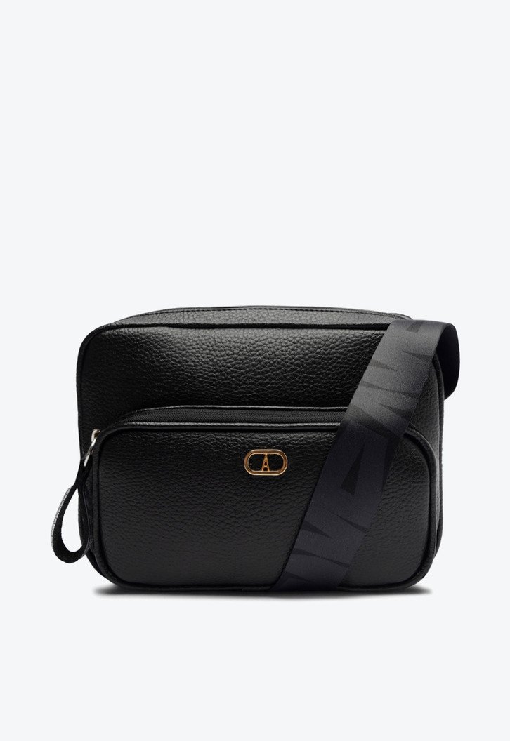 Bolsa tiracolo Estação Anacapri média com alça de gorgurão preta. De shape retangular com acabamento arredondado nos cantos, o modelo possui uma alça transversal e regulável em fita de gorgurão com estampa personalizada da “Estação Anacapri”. De material similar a couro e forrada na parte interna, apresenta bolso externo, traz fechos superiores em zíper com puxador em fita de gorgurão, com etiqueta emborrachada personalizada Anacapri. O modelo traz aplicação de pin metálico em cápsula, com inscrição da inicial “A” - assinatura Anacapri, centralizado na capa frontal do bolso externo.