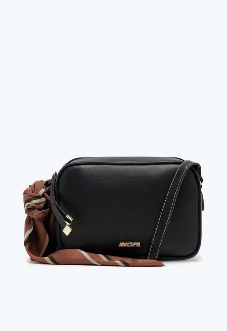 Bolsa tiracolo Itacaré média, na cor preta. O modelo de material similar ao couro possui shape retangular com acabamento arredondado nos cantos, estilo camera bag. No tamanho M, traz alça longa transversal e regulável. Forrada na parte interna, apresenta fecho superior em zíper com puxador em tira. Traz aplicação de pin em cápsula metálica Anacapri, centralizado na parte inferior da capa frontal. A bolsa tiracolo acompanha um lenço exclusivo e delicado com estampa personalizada, com efeito de listras e assinatura Anacapri. O acessório é removível e pode ser utilizado separadamente da bolsa.