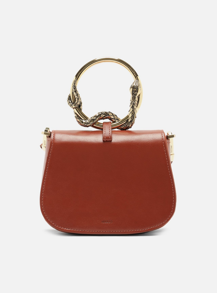 Bolsa de mão feminina com design estruturado. Possui textura lisa e formato curvado na base, com alça metálica trabalhada e em formato circular. Conta com aba frontal rígida e fechamento por botão magnético.