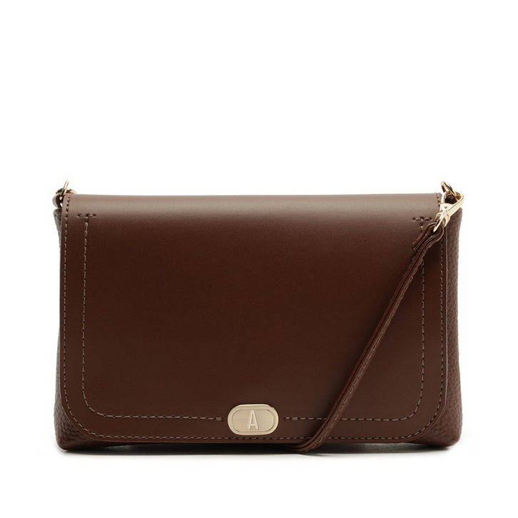 Bolsa tiracolo pequena, com alça removível, na cor marrom. O modelo de material similar ao couro com efeito envernizado traz uma alça longa regulável e removível - com mosquetões para regulagem, podendo ser utilizada como crossbody ou baguete. Com shape retangular estilo mini bag, possui fecho no tampo, por botão de ímã. Apresenta forro interno em tom rosê e aplicação de etiqueta emborrachada Anacapri com a inscrição da frase: “Leve a vida numa bolsa”. Com detalhes em costura dupla contrastante e aplicação de pin metálico em cápsula Anacapri, centralizado na parte inferior do tampo, na capa frontal.