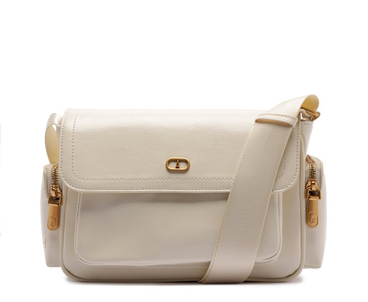 Bolsa tiracolo média, com detalhe de bolsos laterais e alça de gorgurão, na cor branca. O modelo possui shape retangular e estruturado, com laterais arredondadas. De material similar ao couro, com acabamento texturizado e detalhe de costura ornamental nos contornos. Traz alça longa transversal com regulagem em fita de gorgurão confortável, no mesmo tom da bolsa. Traz bolso externo grande - aplicado na capa frontal - com fechamento único em tampo, por botão de ímã. Possui dois bolsinhos nas laterais, ambos com fecho em zíper metálico, exclusivo Anacapri - com acabamento em efeito tamboreado. Com forro vermelho na parte interna, possui etiqueta emborrachada e personalizada Anacapri, com design em ondas. Traz aplicação de pin metálico em cápsula Anacapri, centralizado na parte superior do tampo.