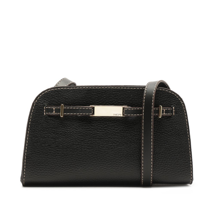 Bolsa tiracolo estruturada média, com textura, na cor preta. De material similar ao couro com efeito texturizado, o modelo traz shape estruturado e arredondado na parte superior, com alça longa transversal. Forrada na parte interna em tom rosê, apresenta fecho superior em zíper e detalhe de acabamentos a fio contrastantes. Traz detalhe frontal na capa, com aplicação de tira fina com placa metálica central imponente, com assinatura Anacapri personalizada.