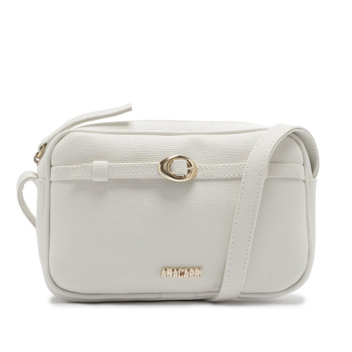 Bolsa tiracolo texturizada média, na cor branca. De material similar ao couro, o modelo tem shape moderno com design retangular - estilo camera bag - bordas arredondadas e acabamento com efeito texturizado. Traz alça transversal longa e apresenta fecho superior em zíper com puxador em tira. Com forro especial em tom rosê, bolsinho interno e aplicação de etiqueta emborrachada personalizada Anacapri. Traz detalhe imponente centralizado na capa frontal, com aplicação de tira afivelada, “estilo cinto”. A bolsa traz aplicação de pin metálico Anacapri, centralizado na parte inferior da capa frontal.
