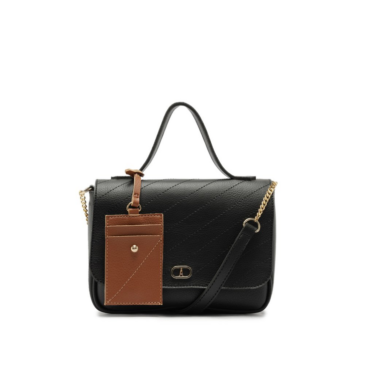 Bolsa tiracolo média, com porta-cartão, na cor preta. O modelo vem para a temporada com shape retangular e estruturado. No tamanho M, de material similar ao couro, possui detalhe de acabamento em costura matelassê com design na diagonal, no tampo da peça. Traz alça longa transversal, com aplicação de correntaria imponente. Com fecho no tampo, por botão de ímã. Traz aplicação de cápsula em metal Anacapri, centralizada na parte inferior do tampo, na capa frontal. Acompanha bag charm com porta-cartão, com três divisórias, no mesmo tom da peça, com aplicação de rebite metálico e costura ornamental no contorno. O acessório é removível e pode ser utilizado separadamente da bolsa.