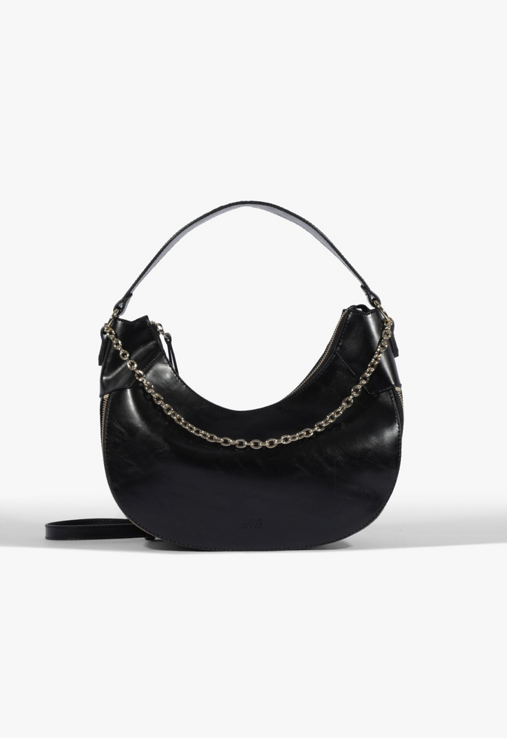 Apresentamos a Bolsa Tiracolo Média Preta, a peça perfeita para adicionar um toque de atitude e sofisticação a qualquer look. Com seu formato meia-lua e o acabamento em verniz, que confere um brilho extra, esta bolsa se destaca pela sua originalidade e design moderno.