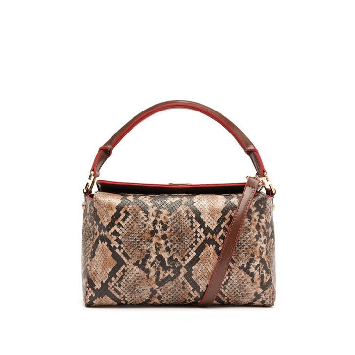 Bolsa tiracolo média, com alça flat, em animal print. O modelo vem para a temporada com o shape retangular e estruturado, com laterais arredondadas. De material similar ao couro com efeito texturizado e acetinado, possui estampa animal print de cobra, com detalhes de acabamentos por toda a peça, com pintura a fio em vermelho. Traz uma alça de ombro flat fixa e uma alça longa transversal removível. Possui fechamento superior na aba, por botão de ímã. Com forro interno vermelho e aplicação de maxi etiqueta emborrachada Anacapri. Traz aplicação de pin metálico em cápsula com inscrição da inicial A - assinatura Anacapri, centralizada na parte inferior da aba.